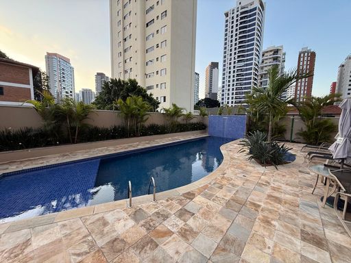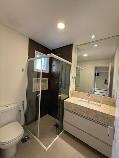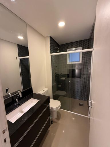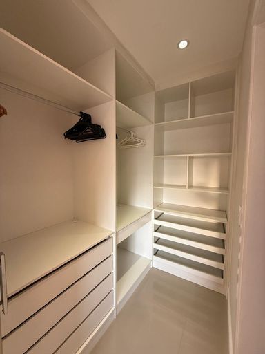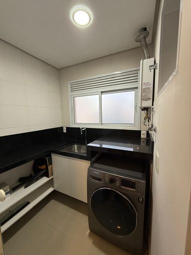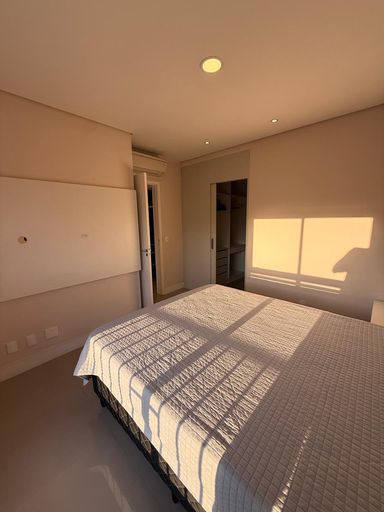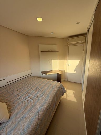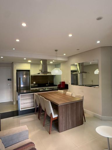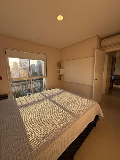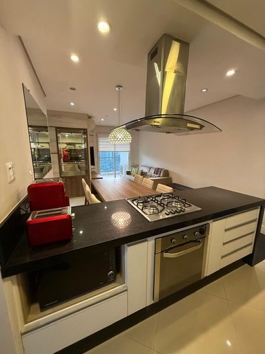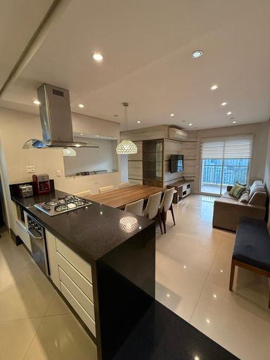 O imóvel possui 2 quartos, sendo 1 suíte, 2 banheiros, sala integrada, cozinha americana, closet, ar-condicionado e 2 vagas de garagem.